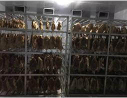 2肉制品熟化工藝是人為的提供合適的溫濕度完成物料的熟化、成分合成、轉(zhuǎn)換等過程。只有在適合的溫濕環(huán)境才能保證臘鴨的顏色和香味,否則達(dá)不到熟化的過程,那么臘鴨的香味就出不來,品質(zhì)也就降低了。